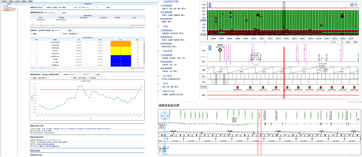 高速铁路建维一体数字化管理信息系统,构建铁路全生命周期电子文库,实现对设备状态精细化评定、规律分析和风险量化,通过网格化管理方法预测维修周期和剩余寿命,为高速铁路安全运营提供决策支持。工务安全生产指挥系统,自动上传轨检车等原始数据生成病害库并评价网格单元,辅助制定作业计划;作业全程由指挥中心通过工务通APP盯控,确保上道有工单、作业留影像、异常能预警,作业后销号更新台账,关联数据并对比维修质量。辅助加强工单管理,在计划层面控制作业范围、作业人员、机具材料、安全隐患、预控措施、主要工作量等。铁路综合维修维护管理平台,通过大数据技术整合机械设备管理、生产管理、作业过程控制、决策支持和机械化维护档案五大子系统,实现铁路资源全生命周期的智能化管理和维护效益最大化。