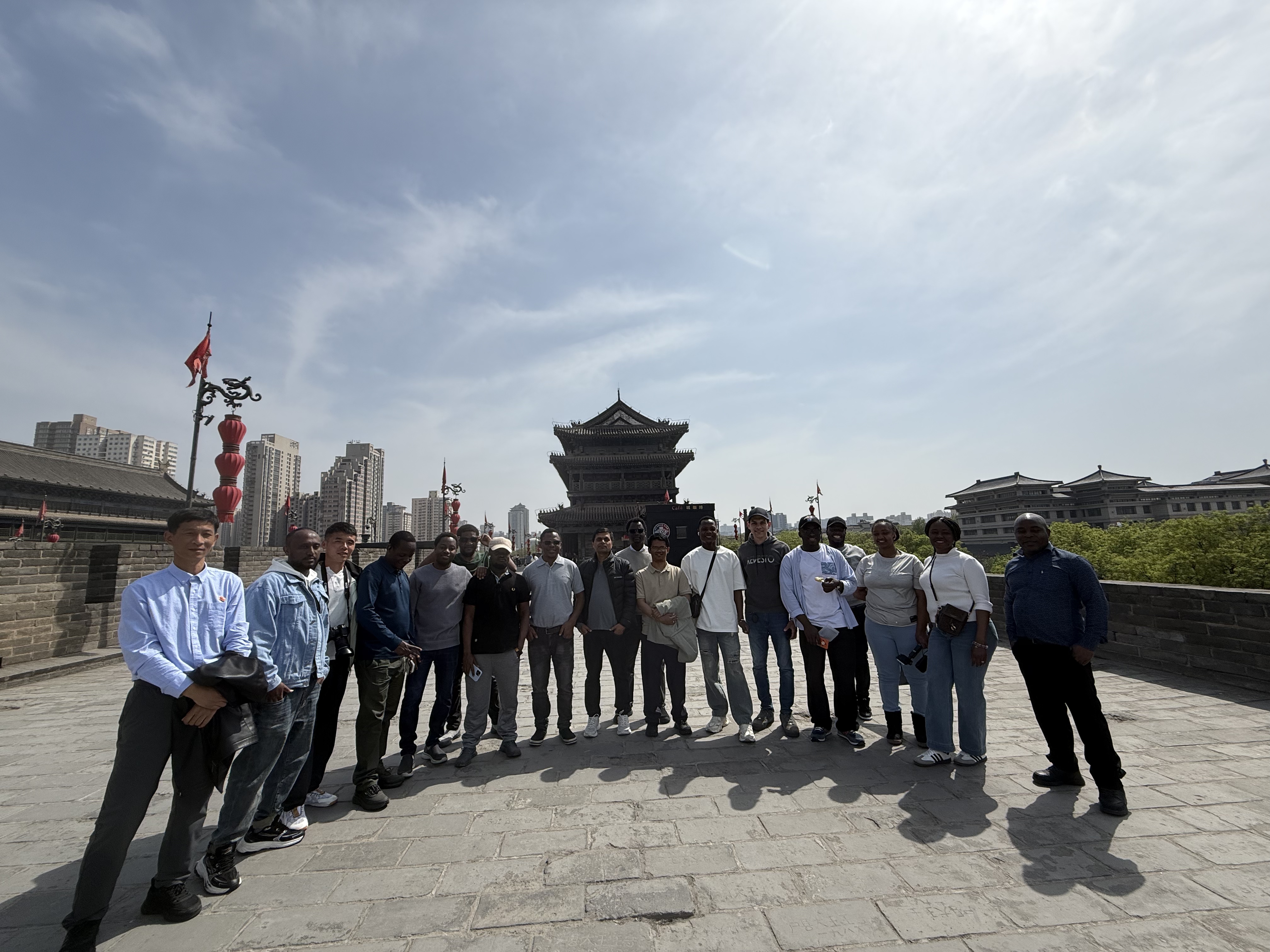 考察第三日,行程聚焦古都人文精粹与民俗风情。留学生们首先来到陕西历史博物院,在丰富的馆藏文物中,梳理西安千年城市发展脉络,从商周青铜器、唐代金银器到历代建筑遗存,全方位读懂这座古都的历史变迁。紧接着,大家登上西安明城墙,漫步在巍峨坚固的城垣之上,俯瞰古城与新城交融的城市风貌,感受中国古代城市防御工程的宏伟气魄;随后前往钟鼓楼广场,欣赏独具特色的明清建筑,感受古都中心的历史韵味。之后,大家先后走进回民街与永兴坊,品尝肉夹馍、羊肉泡馍、甑糕等特色陕味美食,体验地道民俗风情,在舌尖与市井的交融中,感受中华文化的多元包容与市井烟火气。